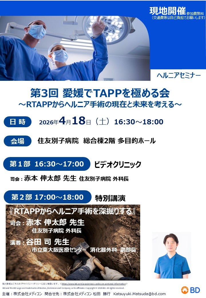 2026年4月18月に愛媛県新居浜市の住友別子病院にて、赤本 伸太郎先生にお招きいただき講演を行いました。