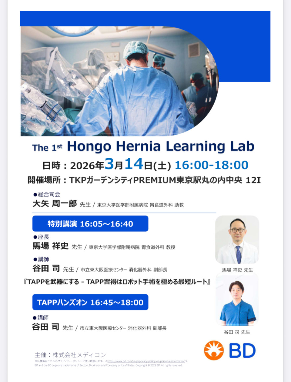 2025年3月14月に東京で開催された「第1回 Hongo Hernia Learning Lab」にて当センター消化器外科の谷田 司副部長が特別講演を行いました。その後、ハンズオンセミナーを行い、東京大学、胃食道外科の先生方や医学部の学生さんと手術模型を用いて手術トレーニングを行いました。